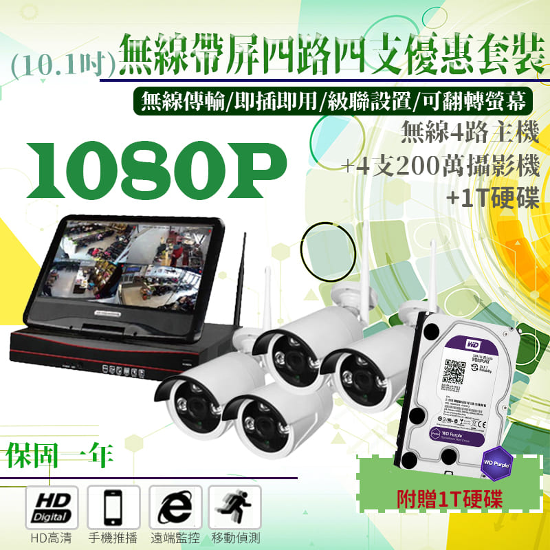 {特惠} 無線IPC 四路四支200萬帶屏優惠套裝 含2TB